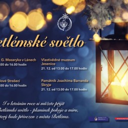 Srdečně zveme na tradiční vánoční akci Betlémské světlo, které na Rakovnicko opět přinášíme ve spolupráci se skauty. Také letos bude na Husově náměstí v Rakovníku a na našich muzejních pobočkách v Lánech, Novém Strašecí, Jesenici a Skryjích plát betlémské světlo dovezené z Betléma, které rozvážejí čeští skauti.